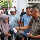 Gubernur Aceh, Muzakir Manaf atau Mualem, membagikan tunjangan hari raya (THR) kepada warga melalui timnya di…